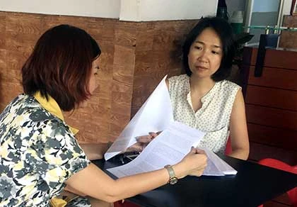 Bà Hà đang trao đổi về vụ việc của mình với phóng viên. Ảnh: H.YẾN