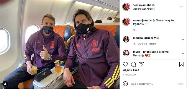 MU bay sang Ba Lan vào đêm thứ hai (giờ Anh) với hi vọng lần thứ hai đăng quang ở Europa League sau lần đầu tiên năm 2017 dưới thời HLV Jose Mourinho. Tiền vệ Nemanja Matic đã đăng một bức ảnh chụp chung cùng đồng đội Edinson Cavani trên máy bay.
