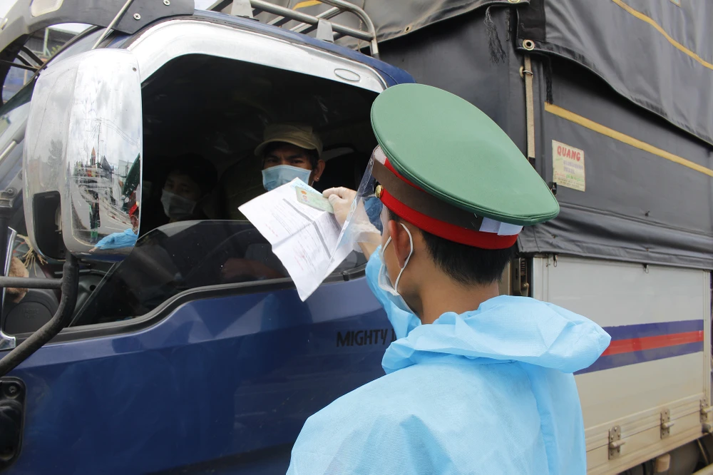 Tài xế khi qua chốt phải xuất trình giấy xét nghiệm âm tính COVID-19 và giấy tờ tuỳ thân cho lực lượng tại chốt.