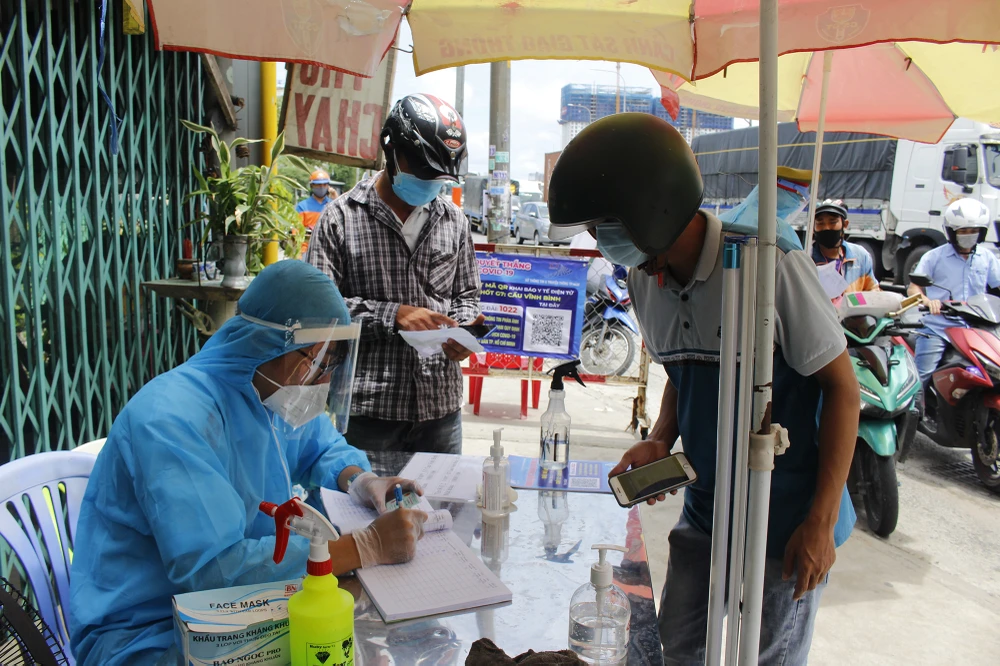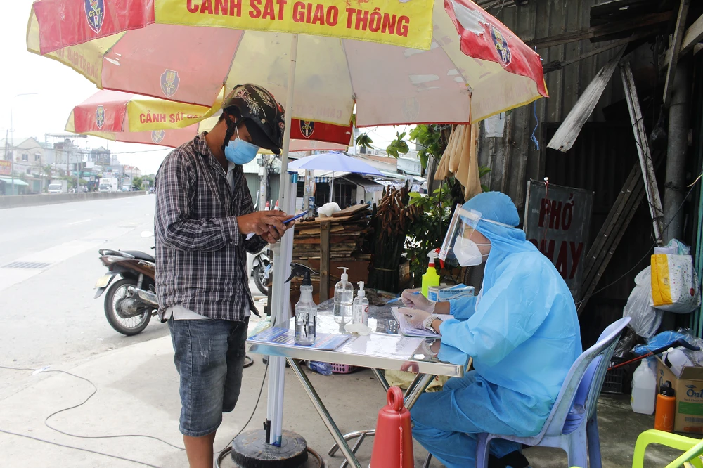 Người đi xe máy từ Bình Dương vào TP.HCM qua chốt bắt buộc phải cung cấp giấy xác nhận âm tính và khai báo y tế tại chốt.