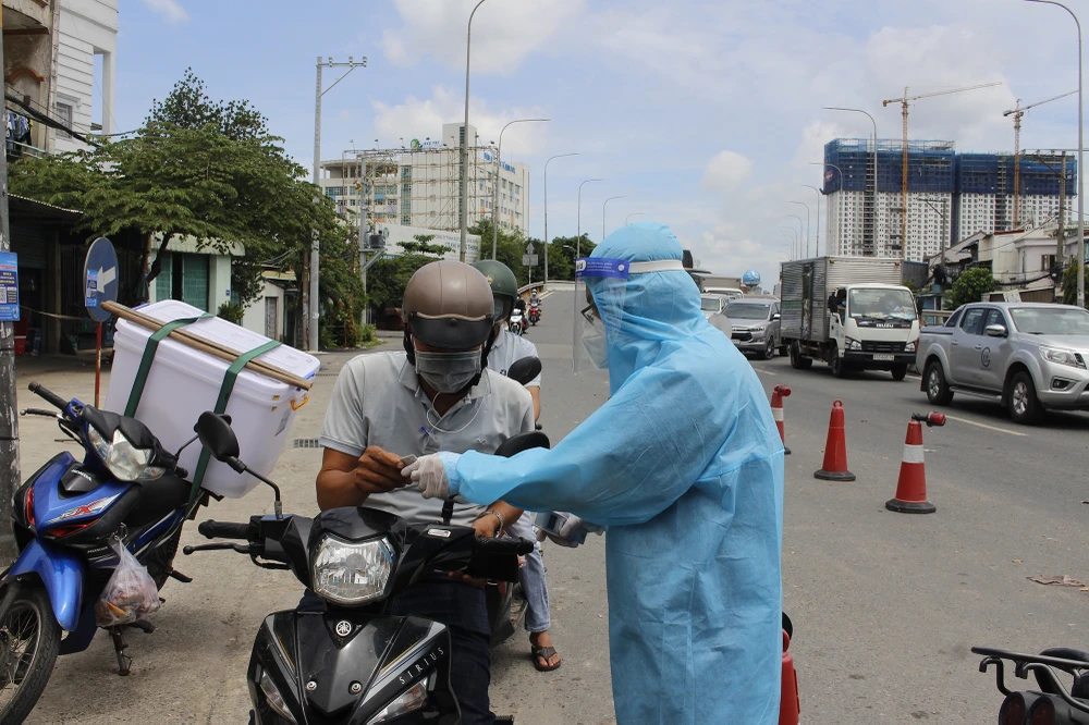 Ghi nhận ngày 16-7, tại chốt kiểm soát dịch COVID-19 chân cầu Vĩnh Bình (phường Hiệp Bình Phước, TP Thủ Đức), lực lượng tại chốt vẫn làm việc cật lực dưới nắng gắt giữa trưa.