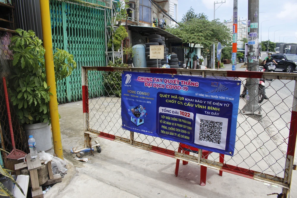 Để hỗ trợ người dân khai báo y tế nhanh chóng và đảm bảo giãn cách, khu vực chốt được bố trí thêm các hình mã QR riêng của chốt. Chốt cầu Vĩnh Bình có mã G7.