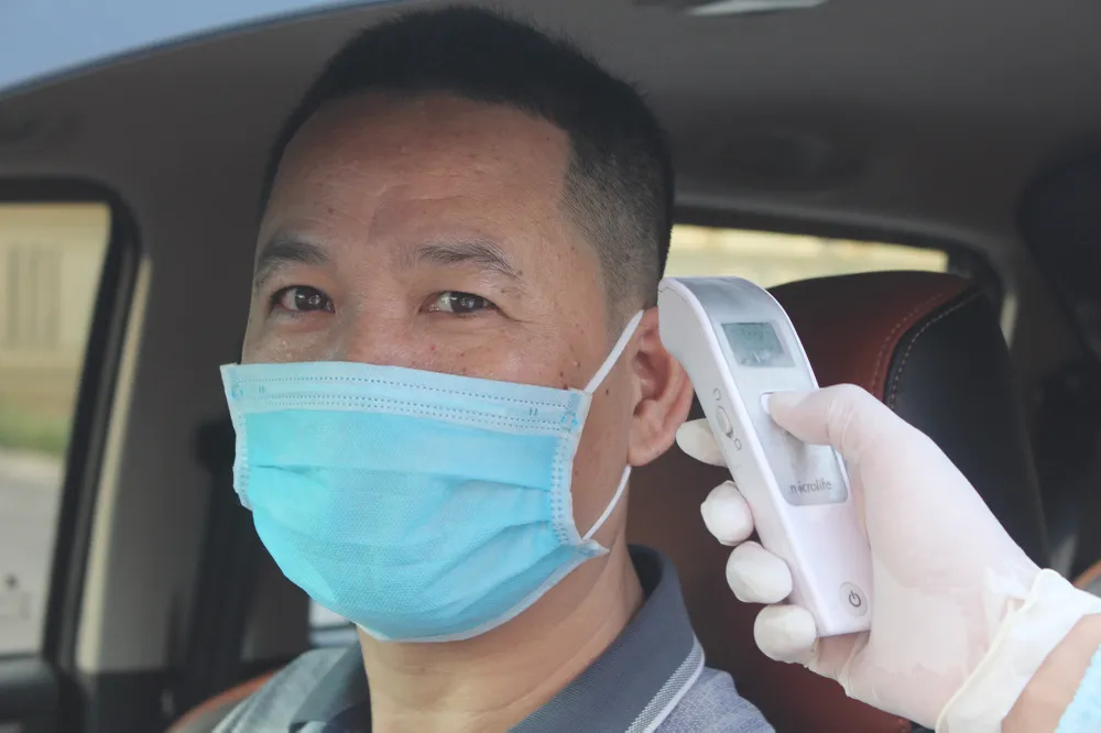 Nhân viên y tế kiểm tra thân nhiệt với tài xế và tất cả người ngồi trên xe.