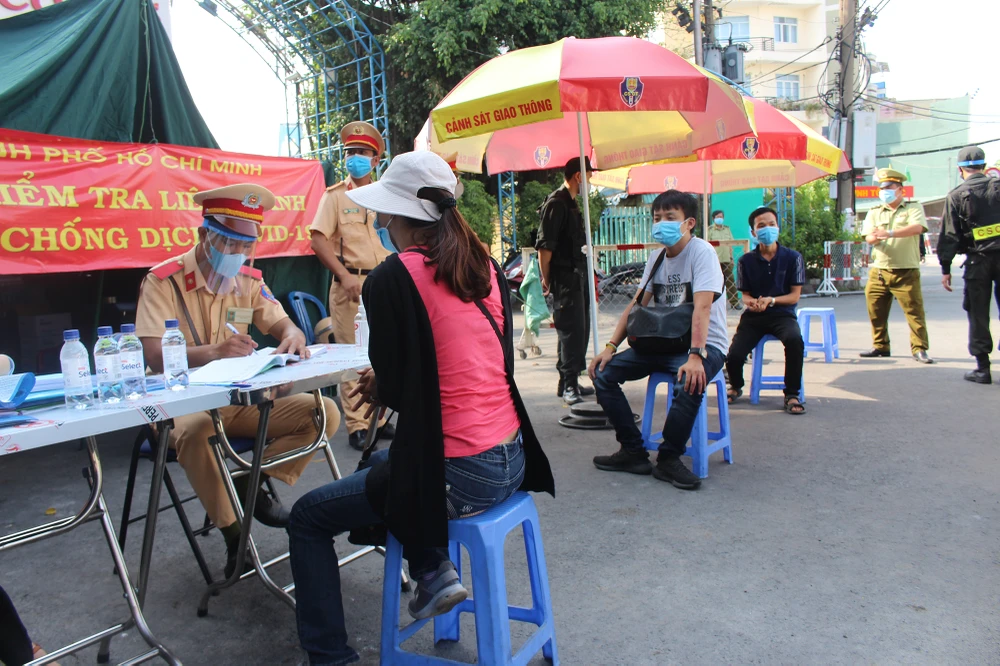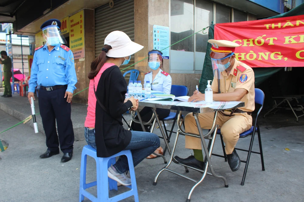 Tại chốt kiểm soát y tế trước cổng Bến xe Miền Đông (quận Bình Thạnh), các ô tô di chuyển trên quốc lộ 13 hướng về vòng xoay Bình Lợi được mời vào kiểm tra y tế. Sau khi được kiểm tra thân nhiệt, tài xế vào bên trong chốt để khai các thông tin cần thiết.