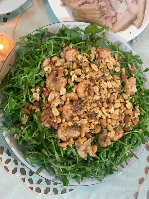 Món gỏi trộn rau đắng thật dễ làm. Rau rửa sạch, để ráo, lột ít tôm nõn ướp nước mắm, hành tím, tiêu, um với dầu cho thơm, đậu phộng rang vàng, bóc vỏ, giã dập. Đậu phộng giã dập cũng thơm không kém!