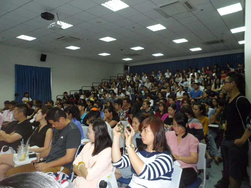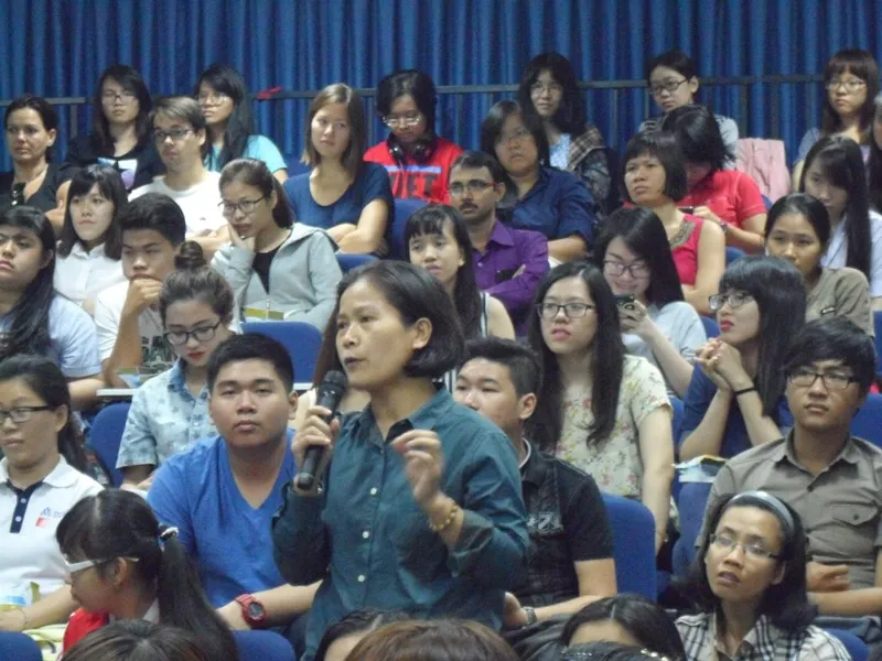 Hội trường buổi giao lưu có sức chứa hơn 100 người nhưng số người đến tham gia vượt mức dự kiến gấp hai lần nên BTC phải kê thêm nhiều ghế, những bạn sinh viên đến muộn hơn chấp nhận đứng hoặc ngồi bệt giữa bậc cầu thang để được gặp và lắng nghe những chia sẻ của Christine Hà.