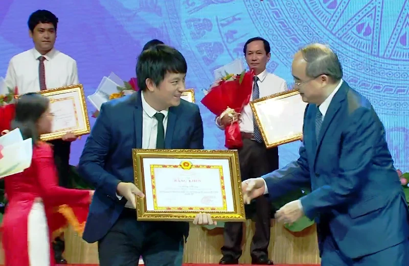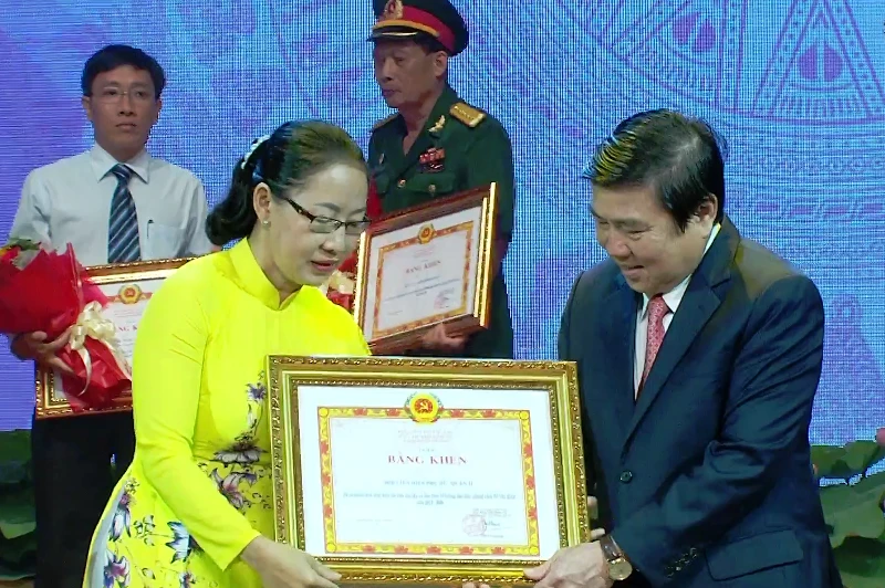 Chủ tịch UBND TP Nguyễn Thành Phong tặng bằng khen cho tập thể thực hiện tốt học tập và làm theo tư tưởng, đạo đức, phong cách Hồ Chí Minh. Ảnh: TÁ LÂM