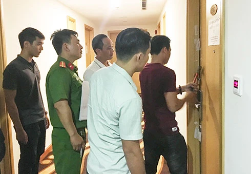 Lực lượng công an yêu cầu nhân viên KS Bavico phá khóa để giải cứu các chủ căn hộ. Ảnh: VĂN KỲ