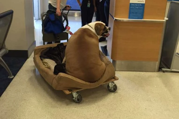 Chú chó béo ú Hank có chuyến bay bằng vé hạng nhất từ Los Angeles đến Denver, Mỹ. (Ảnh: Straitstime)