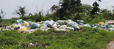 Các bao tải chứa rác công nghiệp vẫn được đổ sau khi cơ quan chức năng phát hiện quả tang. (Ảnh chụp ngày 24-7). Ảnh: TIẾN DŨNG