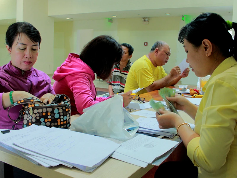 Cư dân Carina đến nhận tiền hỗ trợ lần cuối sáng 7-8. Ảnh: LÊ THOA