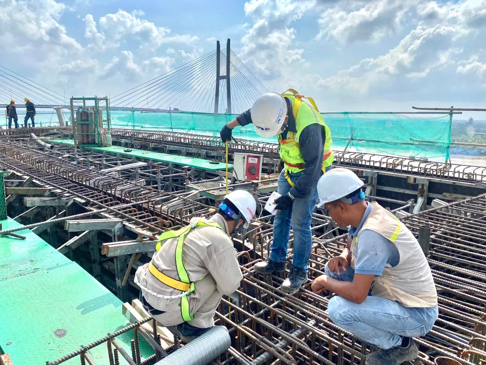 Nhịp chính dây văng được thi công từ 19-8-2022 dự kiến đến 30/10/2023 bao gồm 16 đốt đúc nhịp chính trên mỗi trụ tháp. Trong đó đốt K1 đúc trên đà giáo, dự kiến khoảng 4 tháng; đúc hẫng đốt K2-K16, dự kiến 15 ngày/đốt đúc; đốt hợp long biên dự kiến 1,5 tháng; đốt hợp long giữa dự kiến 1,5 tháng. Công tác thiết kế xe đúc thi công dầm chủ: đã hoàn thành, tư vấn giám sát kiểm tra, chấp thuận.