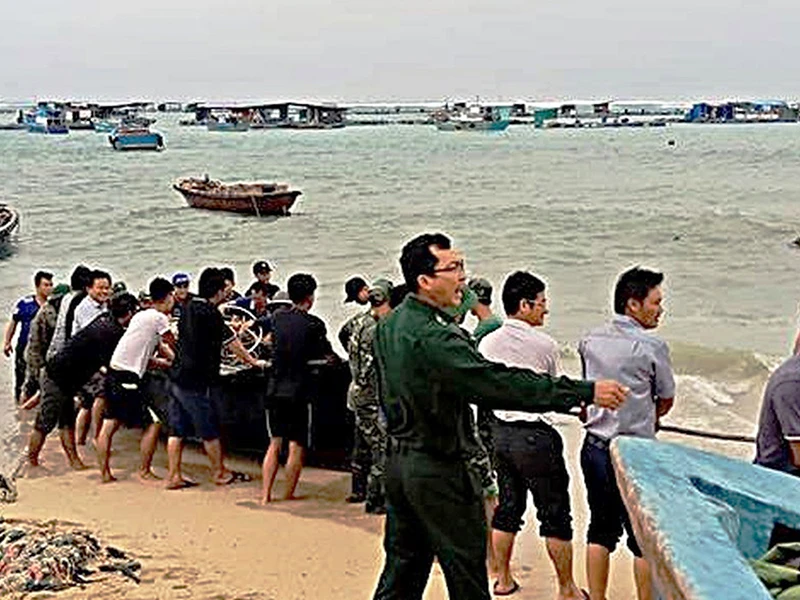 Quân dân đảo Phú Quý, Bình Thuận đưa tàu thuyền vào nơi tránh bão. Ảnh: PN