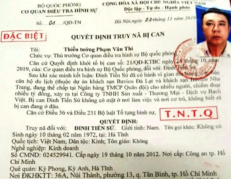 Quyết định truy nã đối với Đinh Tiến Sử. Ảnh: T.LỘC