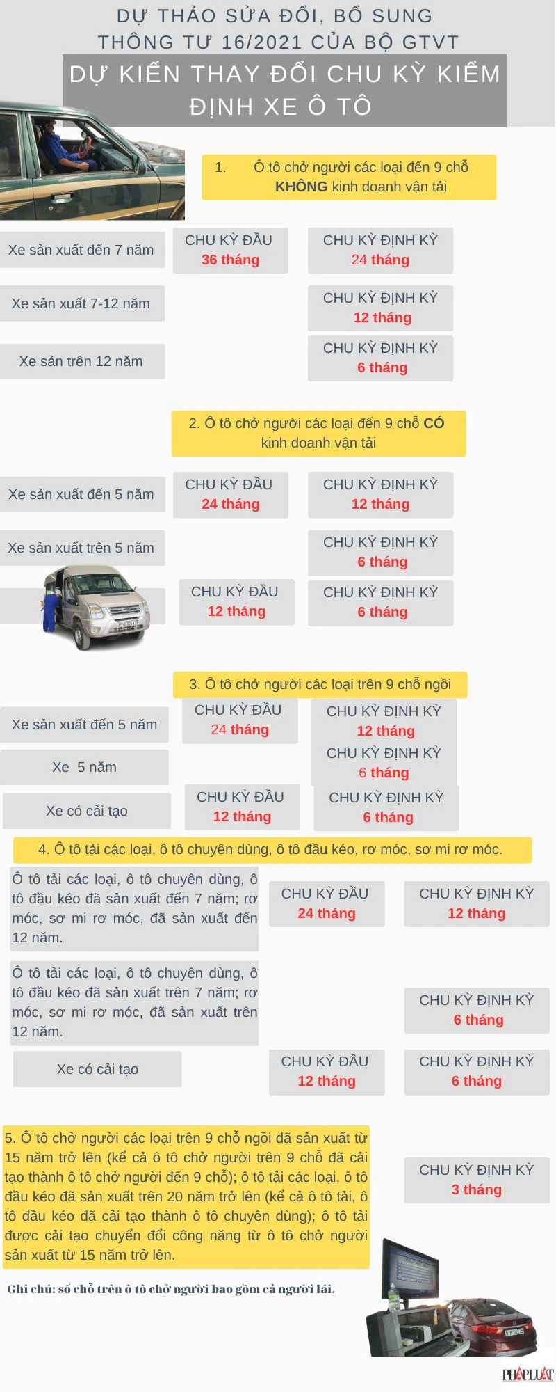 (PLO)- Dự thảo sửa đổi, bổ sung Thông tư 16/2021 của Bộ GTVT thay đổi chu kỳ kiểm định xe ô tô theo hướng dài hơn so với quy định hiện hành.