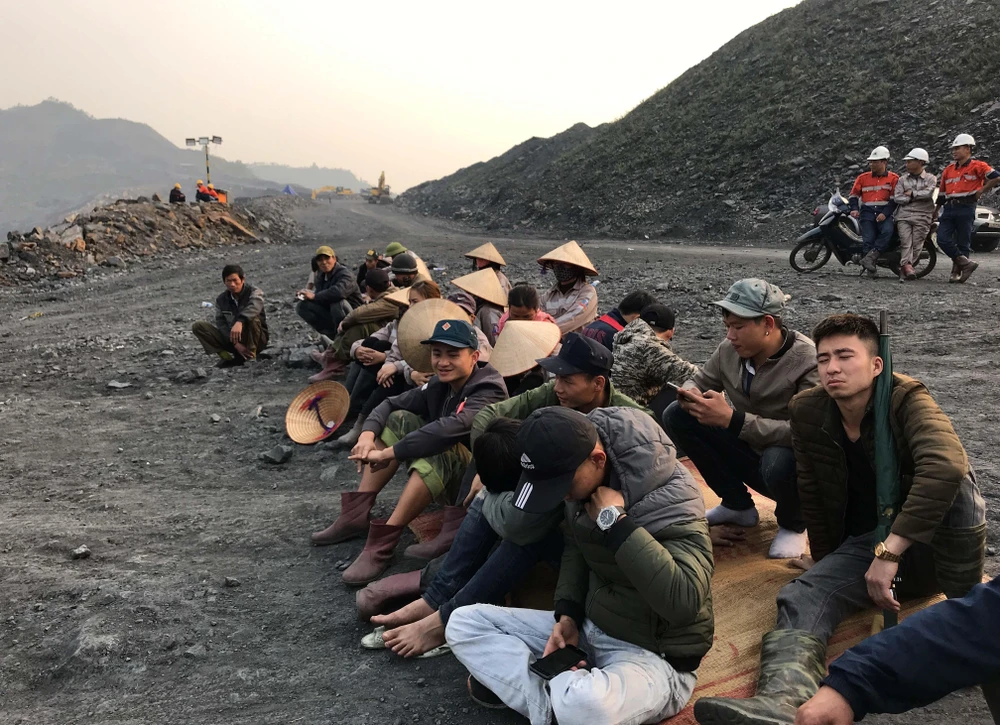 Hàng chục công nhân, bảo vệ Tân Việt Bắc tập trung ngăn việc di chuyển phương tiện ra khỏi khai trường, gần đó bảo vệ Vietmindo canh chừng.