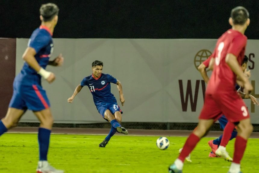 Tuyển Singapore (xanh) trong trận giao hữu thứ nhất thua Kyrgyzstan 1-2. Ảnh: S.T