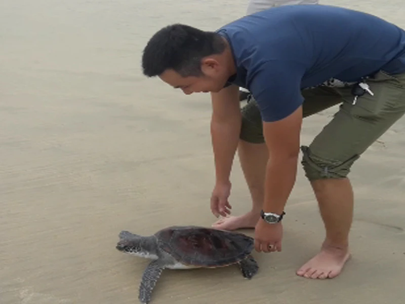 Anh Tân thả chú rùa về biển. Ảnh: HT