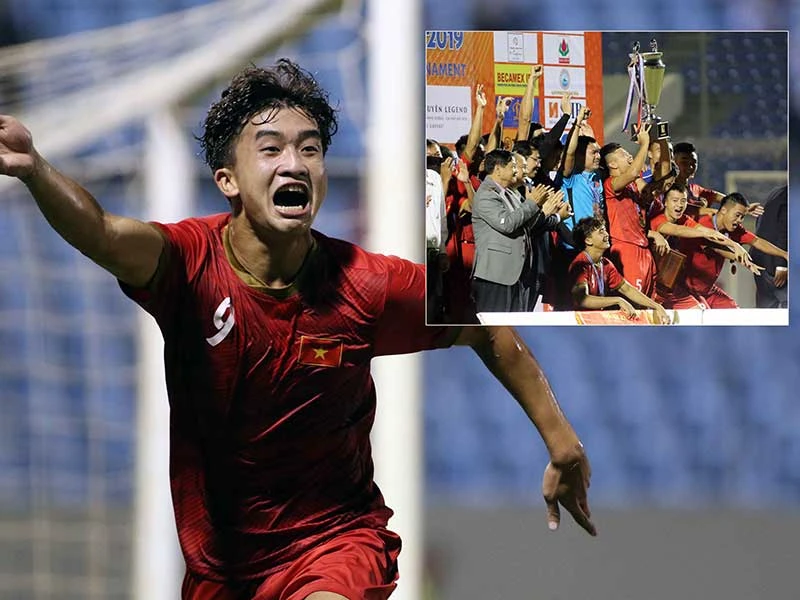 Danh Trung, cầu thủ mở tỉ số cho U-21 TCVN và chức vô địch của các cầu thủ chủ nhà. Ảnh: XUÂN HUY