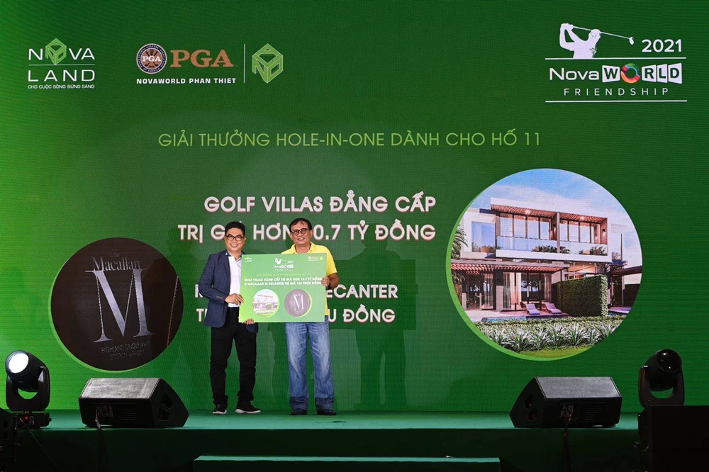 Đại diện Ban lãnh đạo Novaland trao giải hole in one đầu tiên của giải đấu NovaWorld Friendship 2021. Ảnh: SÔNG THU.