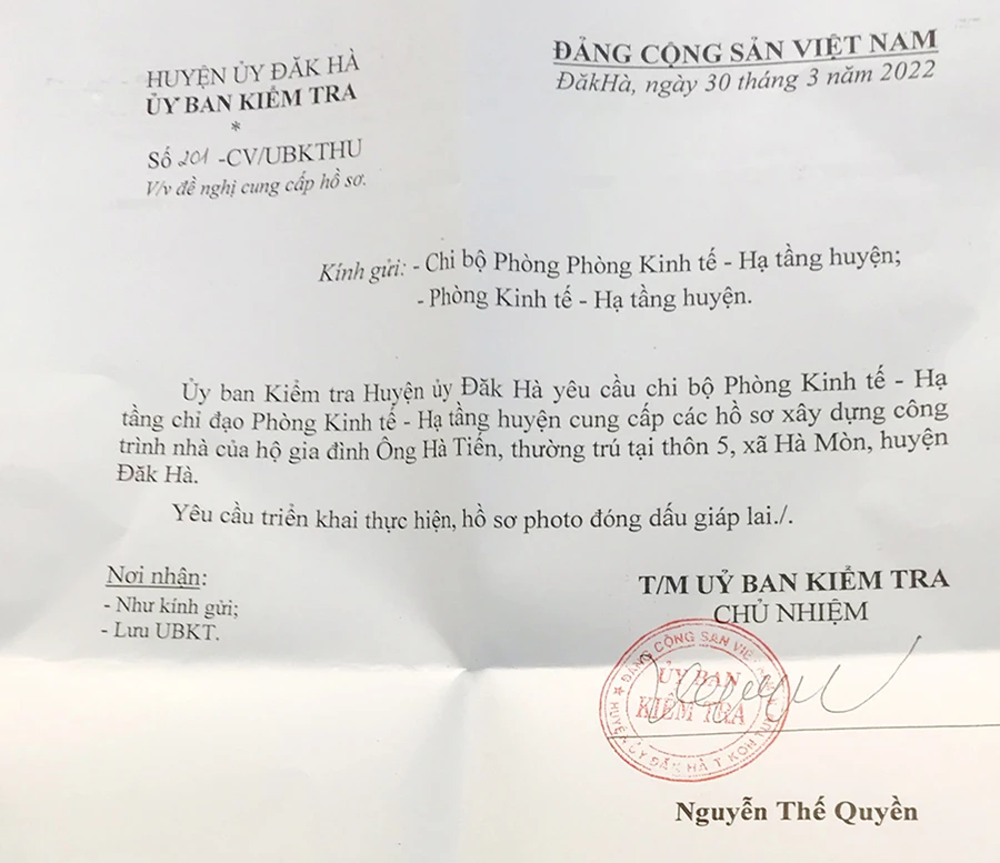 | “Không giám sát nữa” Trao đổi trực tiếp với PV Pháp Luật TP.HCM, ông Nguyễn Thế Quyền, Chủ nhiệm Ủy ban Kiểm tra Huyện ủy Đắk Hà, cho biết ông chỉ ra văn bản yêu cầu cung cấp hồ sơ chứ không kiểm tra nhà chủ tịch huyện. Đây là nội dung trong công tác. Hiện Phòng Kinh tế - Hạ tầng vẫn chưa cung cấp thông tin này nên không giám sát nữa. PV đặt câu hỏi ông có mâu thuẫn gì với ông Hà Tiến liên quan đến việc ông bị xử phạt hay không mà ra yêu cầu cung cấp hồ sơ nhà riêng ông Hà Tiến chứ không phải ai khác? Ông Quyền nói: “Tôi không có mâu thuẫn gì. Còn tôi ra văn bản yêu cầu cung cấp hồ sơ là có lý do nhưng không tiện cung cấp”. |