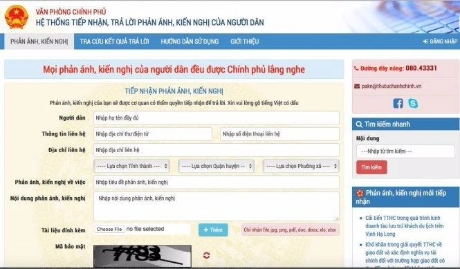 Giao diện hệ thống tiếp nhận ý kiến của người dân