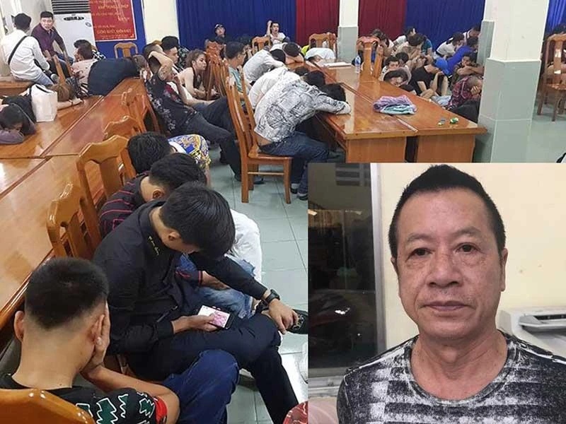 Cả trăm thanh niên được đưa về trụ sở công an kiểm tra và chủ quán bar Lê Văn Tiến (ảnh nhỏ). (Ảnh do công an cung cấp)