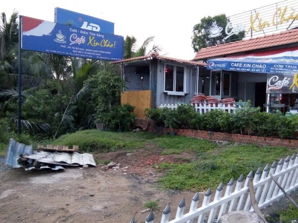 Chiếc container hoán cải (góc trái) mà ông chủ quán Xin chào thuê xe chở đến đặt trên đất làm nơi chứa nồi niêu, ly tách.