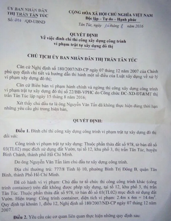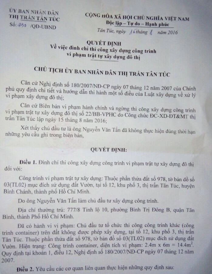 Theo quyết định, ông Tấn có hành vi vi phạm: Tổ chức thi công công trình container trên đất không được phép xây dựng theo khoản 1 Điều 12 Nghị định 180/2007. Yêu cầu các đơn vị cấp điện, cấp nước phải dừng ngay việc cấp điện, cấp nước đối với công trình vi phạm trong vòng 24 giờ kể từ khi nhận được quyết định đình chỉ; Trưởng Công an thị trấn Tân Túc tổ chức lực lượng cấm các phương tiện vận tải chuyên chở vật tư, vật liệu và người lao động vào thi công xây dựng công trình vi phạm; Trong thời hạn ba ngày ông Tấn phải tự tháo dỡ, nếu không sẽ bị cưỡng chế.