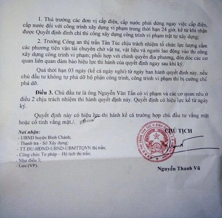 Quyết định đình chỉ thi công công trình của ông Tấn