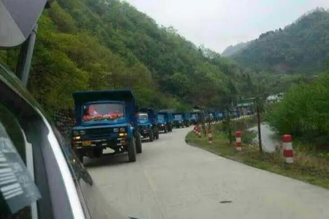Ngày 8/4, đoàn xe gồm 18 chiếc xe tải trong một lễ rước dâu đã thu hút sự chú ý của người dân huyện Lược Dương, thành phố Hán Trung, tỉnh Thiểm Tây, Trung Quốc. (Nguồn: QQ)