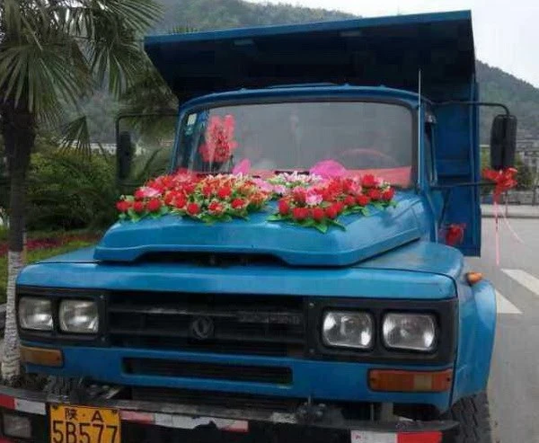 Mỗi chiếc xe đều được dán chữ Hỷ và gắn hoa phía trước. (Nguồn: QQ)