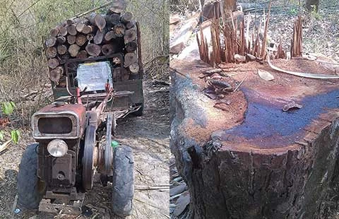 Lâm tặc chở máy cưa vào và chở gỗ ra khỏi rừng mà không hề thấy bóng dáng lực lượng chức năng (ảnh trái). Hiện trường vụ phá rừng dầu tại tiểu khu 70. Ảnh: PN