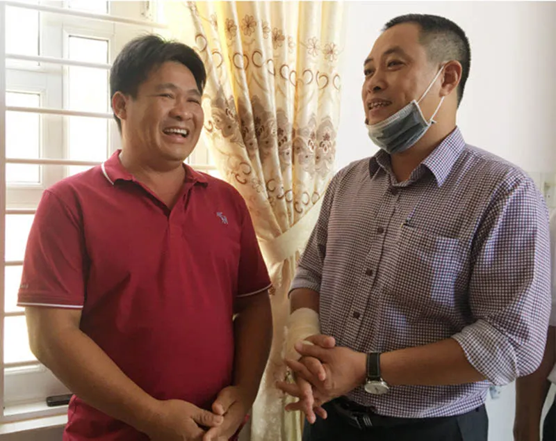 Đại diện Công ty TNHH MTV Vận tải biển Gemadept (phải) thăm hỏi chủ tàu cá bị nạn. Ảnh: HT