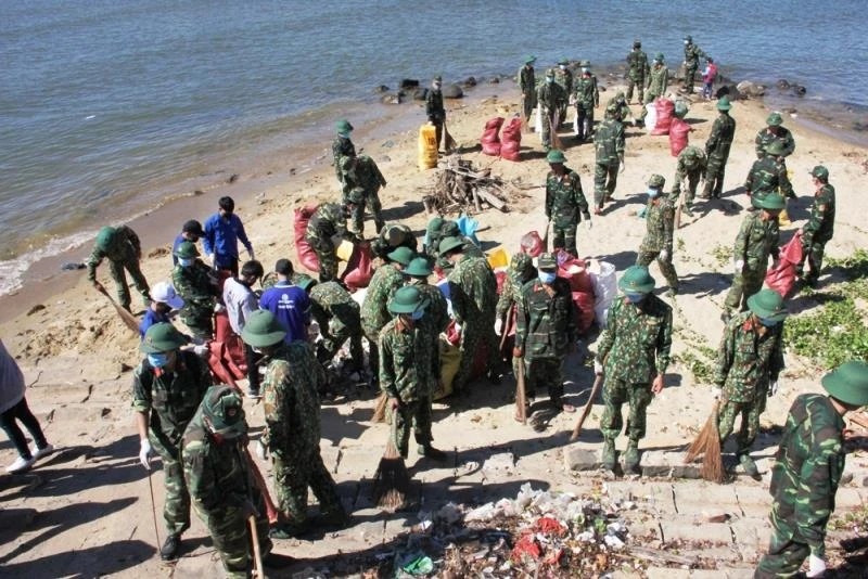 Đoàn viên thanh niên lực lượng vũ trang tham gia gom rác.