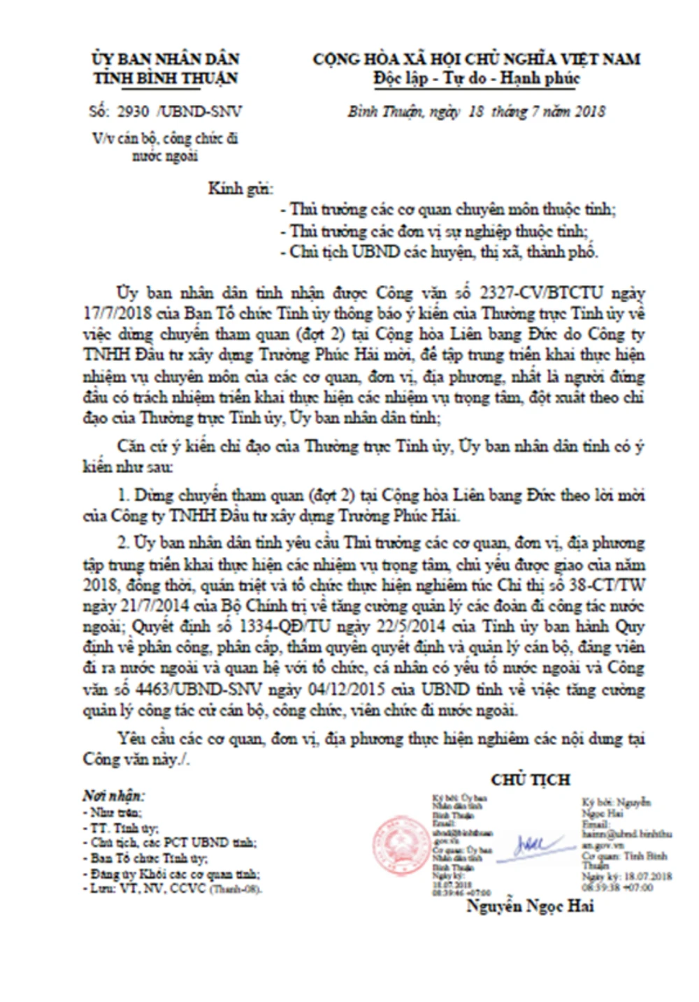 Như đã đưa, ngày 11-6, ông Nguyễn Ngọc Hai, Chủ tịch UBND tỉnh Bình Thuận, đã ký các quyết định cho khoảng 10 cán bộ là giám đốc, phó giám đốc các sở/ngành của tỉnh Bình Thuận đến CHLB Đức đợt 1 để “tiếp cận công nghệ 4.0”. Toàn bộ chi phí cho chuyến đi này do Công ty Trường Phúc Hải (TP.HCM) tổ chức và đài thọ.