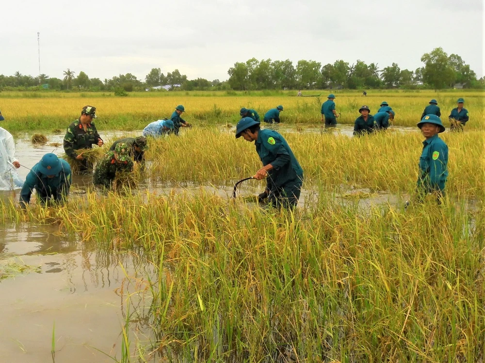 Bộ đội xuống ruộng ở Cà Mau thu hoạch lúa giúp dân. Ảnh: CTV