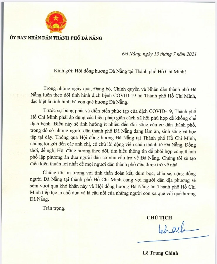 Sáng 15-7, Chủ tịch UBND TP Đà Nẵng Lê Trung Chinh đã có thư gửi Hội đồng hương Đà Nẵng tại TP.HCM.