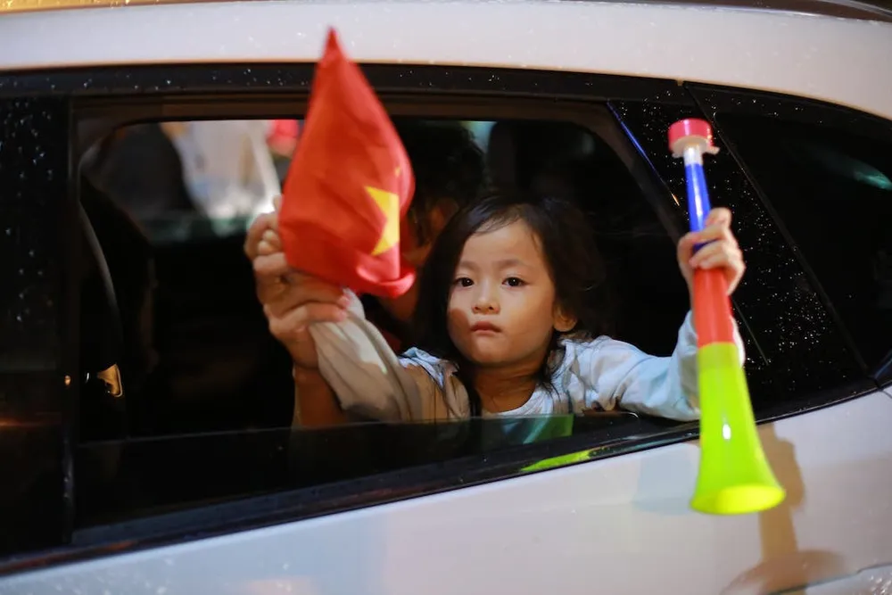 Một em bé theo cha mẹ đi cổ vũ cho đội tuyển Việt Nam ở trận lượt đi vừa qua. Ảnh: HẢI HIẾU