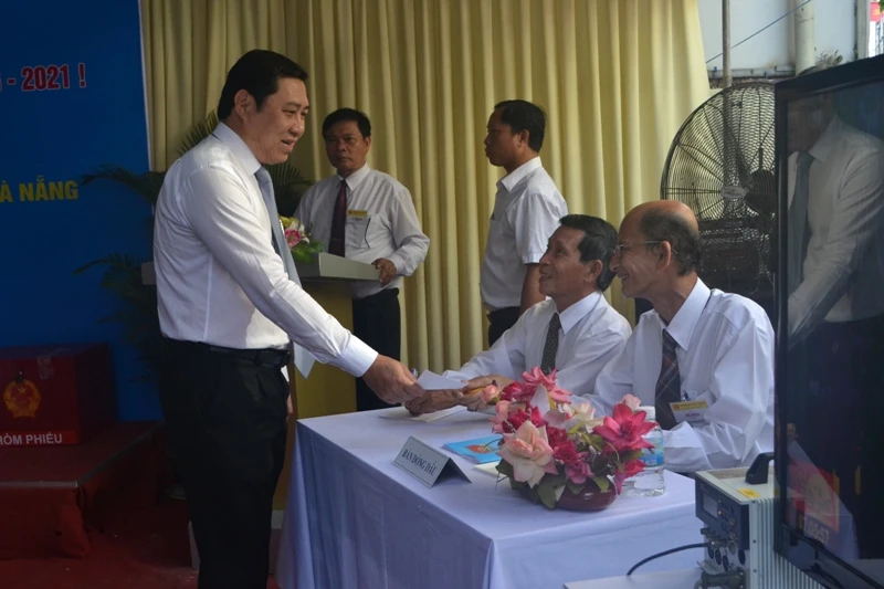 Ông Thơ tham gia bỏ phiếu ở khu vực phường Vĩnh Trung. Ảnh: Tấn Tài