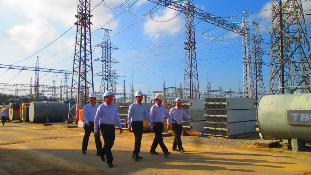 Ông Nguyễn Tuấn Tùng và lãnh đạo EVNNPT kiểm tra tình hình vận hành tại Trạm biến áp 500 kV Dốc Sỏi (Truyền tải điện Quảng Ngãi).
