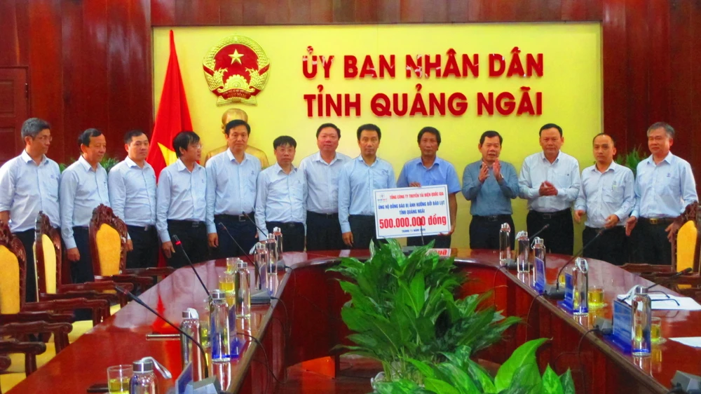 Đoàn lãnh đạo EVNNPT trao quà ủng hộ 500 triệu đồng đến đồng bào vùng lũ tỉnh Quảng Ngãi.