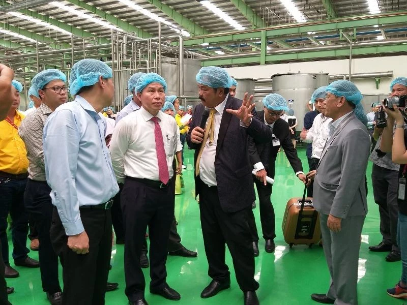Chủ tịch UBND tỉnh Hậu Giang Lê Tiến Châu khảo sát tại một nhà máy sản xuất nước giải khát trên địa bàn tỉnh.