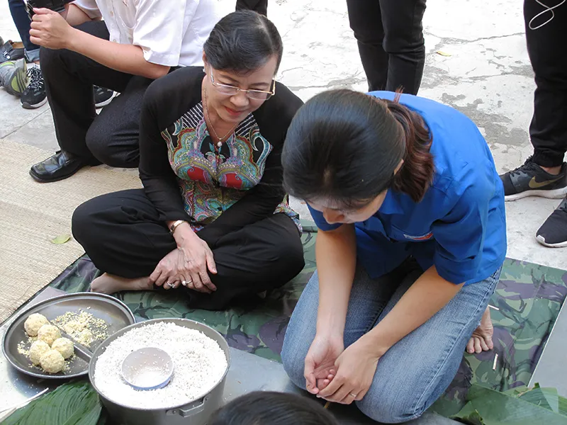Sau khi quan sát, bà cũng bắt tay trổ tài gói bánh chưng của mình.