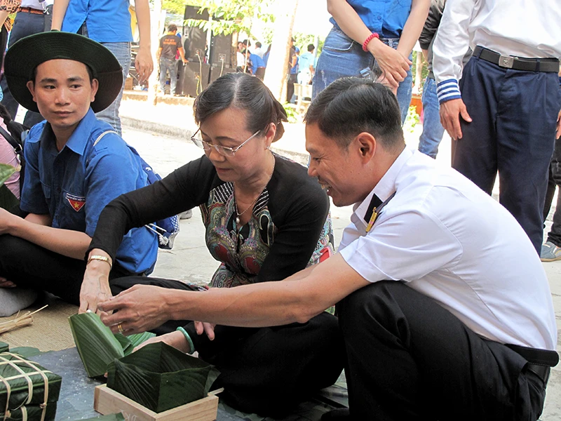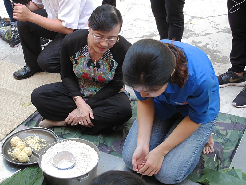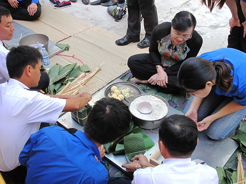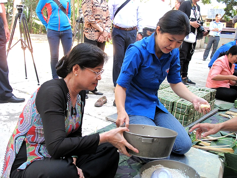Ngay từ khi bắt đầu chương trình, Chủ tịch HĐND TP Nguyễn Thị Quyết Tâm đã hòa mình cùng với hàng trăm chiến sĩ Tiểu đoàn DK1 - Vùng 2 Hải quân, thanh niên TP ca hát và gói bánh chưng, chào đón tết Bính Thân.
