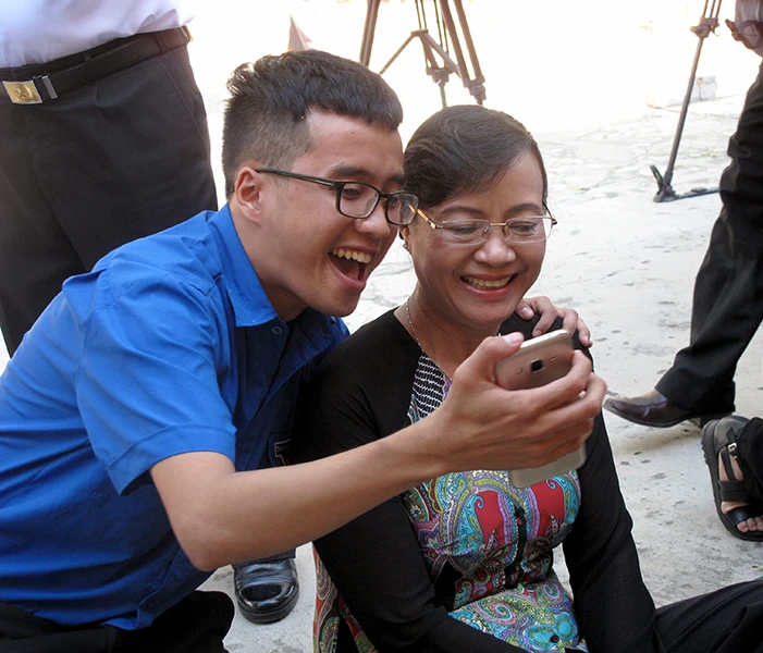 Một thanh niên tranh thủ chụp ảnh "tự sướng" với Chủ tịch HĐND TP.