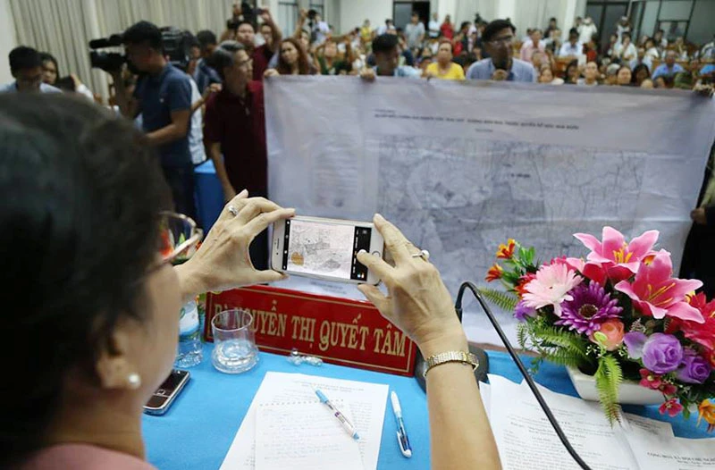 Bà Quyết Tâm chụp lại bản đồ mà cử tri cung cấp tại cuộc họp.