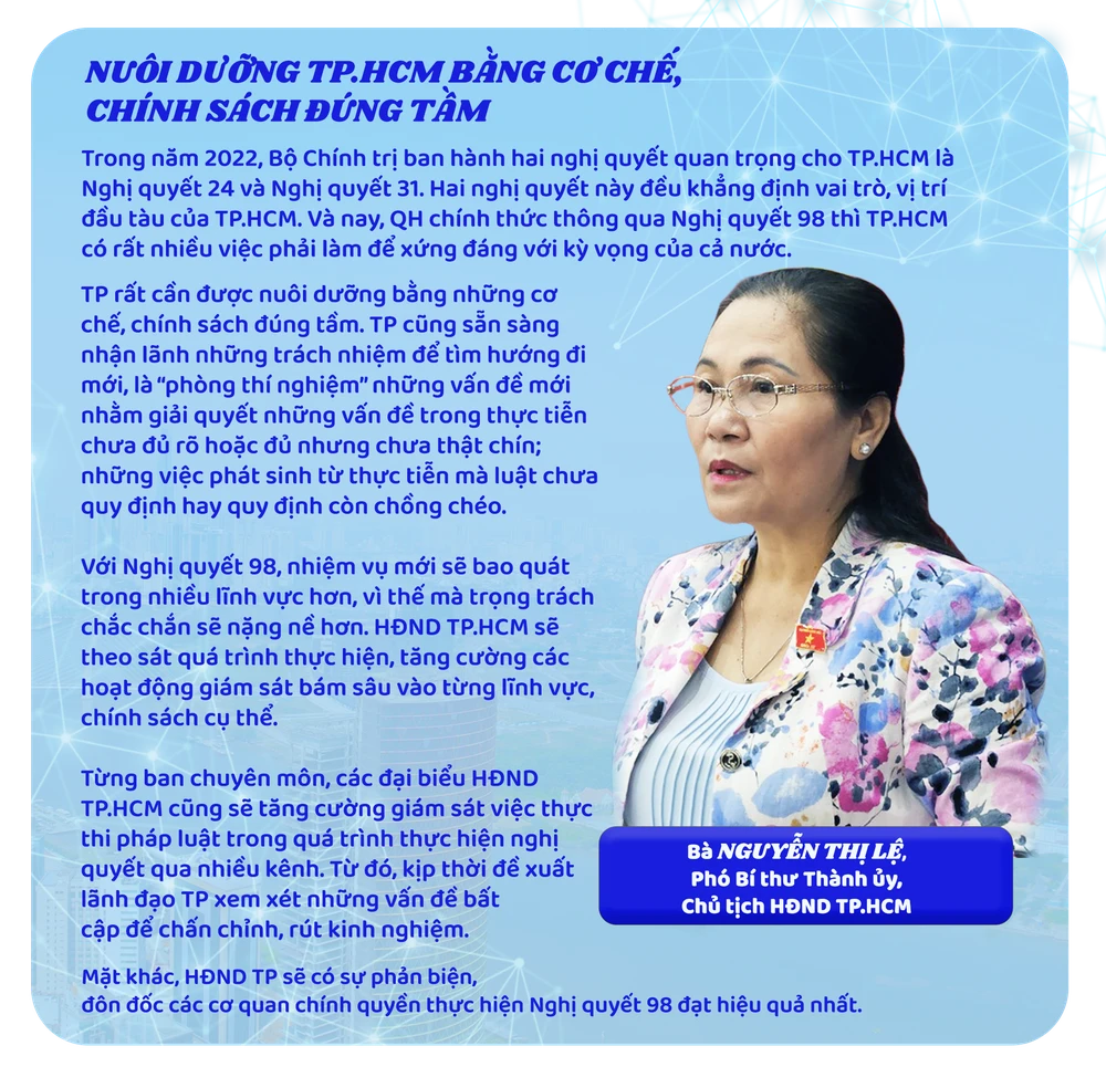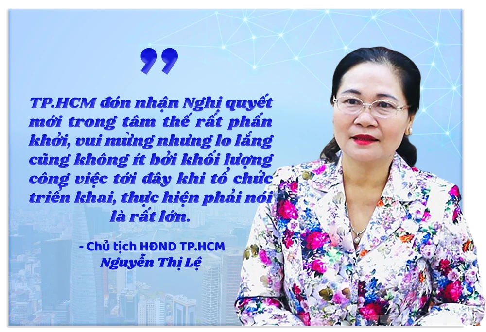 Chia sẻ với báo Pháp Luật TP.HCM, bà Nguyễn Thị Lệ, Phó Bí thư Thành ủy TP.HCM, Chủ tịch HĐND TP, nói: “TP đón nhận nghị quyết mới trong tâm thế rất phấn khởi, vui mừng nhưng nói thật là lo lắng cũng không ít. Phấn khởi, vui mừng là vì với nghị quyết này, TP đã nhận được sự tin cậy, ủng hộ rất cao từ trung ương, QH, Chính phủ, của người dân TP; còn lo lắng là bởi khối lượng công việc tới đây khi tổ chức triển khai, thực hiện Nghị quyết 98, phải nói là rất lớn. Trong đó có những việc rất khó, đòi hỏi sự phối hợp nhuần nhuyễn, nỗ lực, quyết tâm cao độ của toàn hệ thống chính trị, để chuyển hóa những nội dung của nghị quyết thành giá trị phát triển cho TP.HCM”.