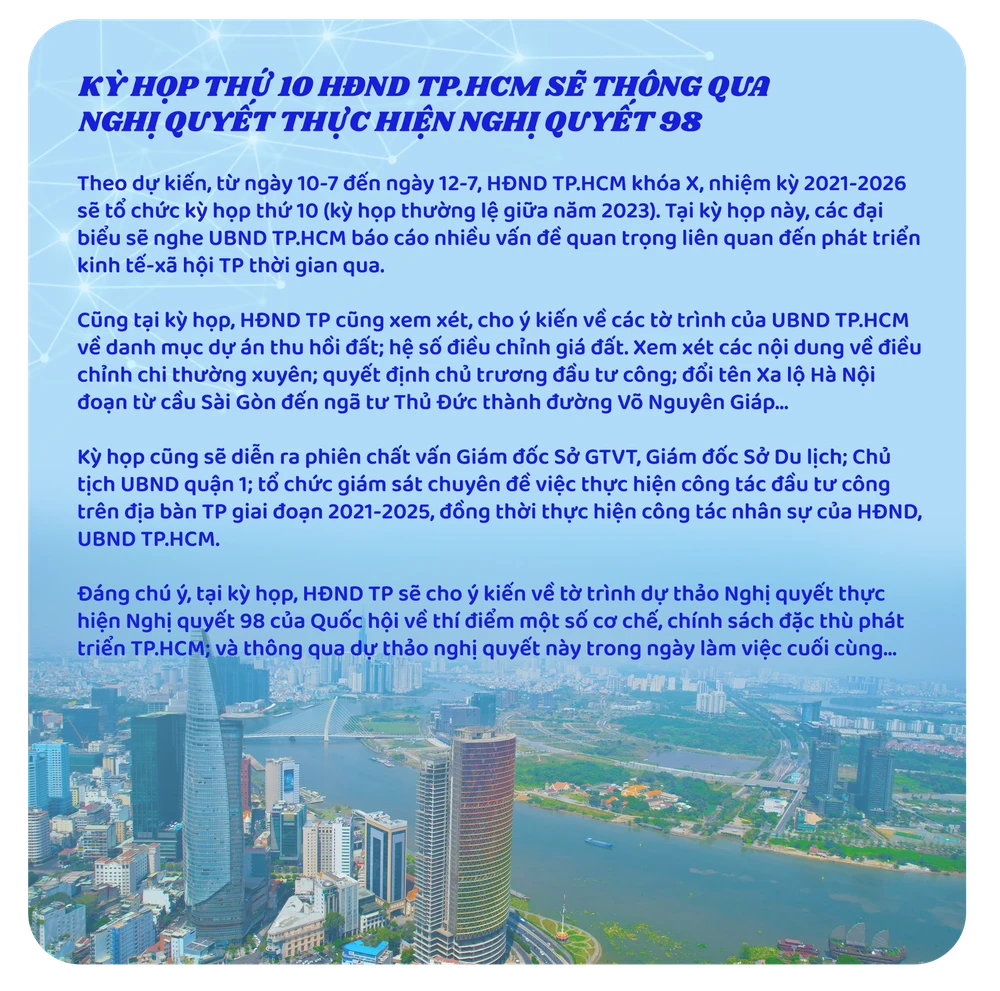 Thường trực HĐND TP đã chủ động phân công cho các ban chuyên môn lên kế hoạch, làm việc với các sở, ngành để các đơn vị này sớm tham mưu cho UBND TP hoàn thiện các tờ trình, trình HĐND xem xét thông qua tại kỳ họp thứ 10 này. HĐND TP cũng sẵn sàng tổ chức các kỳ họp chuyên đề, đột xuất để xem xét, thông qua các tờ trình mà UBND TP thấy cần thiết khi triển khai, thực hiện Nghị quyết 98.