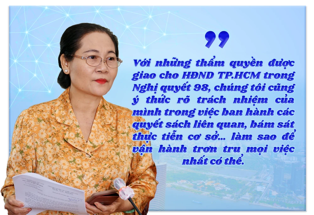 .Phóng viên: Thưa bà, trong những cơ chế đặc thù mà Nghị quyết 98 trao cho TP.HCM, có thể thấy vai trò, thẩm quyền được đặt lên vai HĐND TP là rất lớn. Với vai trò là Chủ tịch HĐND TP.HCM, bà có thấy áp lực nhiều về điều này không?